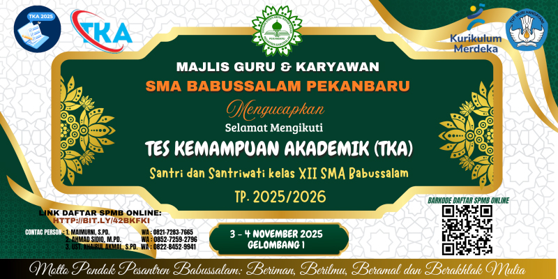 Tes Kemampuan Akademik (TKA) Kelas XII SMA Babussalam Pekanbaru berjalan lancar tanpa kendala apapun. TKA digelar selama dua hari dari tanggal 3 - 4 November 2025 di sekolah.