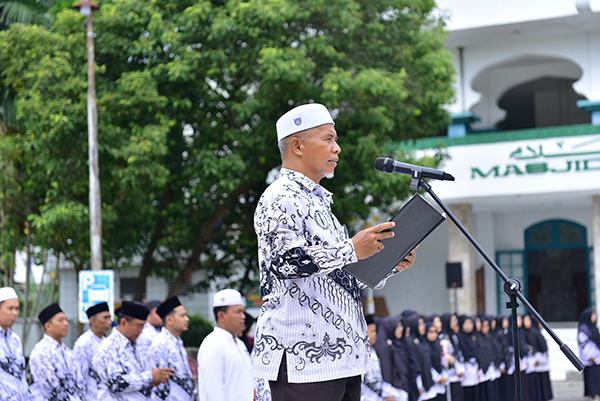 Sebagai Inspektur Upacara, Ustadz Slamet Riadi menyampaikan amanat yang menggugah semangat seluruh peserta. Dalam pidatonya, beliau menegaskan pentingnya menguatkan peran guru dalam menghadapi tantangan zaman.