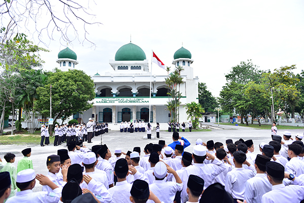 Upacara berlangsung di halaman parkir Masjid Darussalam kompleks Ponpes Babussalam, 25 November 2025. Guru, karyawan dan para santri dari TK, SD, SMP dan SMA hadir menjadi peserta upacara.