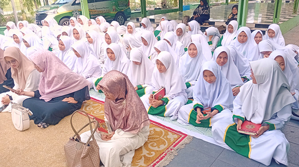 Setelah itu, seluruh santri bersama-sama membaca Surah Al-Waqi’ah. Disusul dengan lantunan Sholawat Nariyah yang menggema memenuhi lapangan sekolah dan menambah suasana semakin tenang.