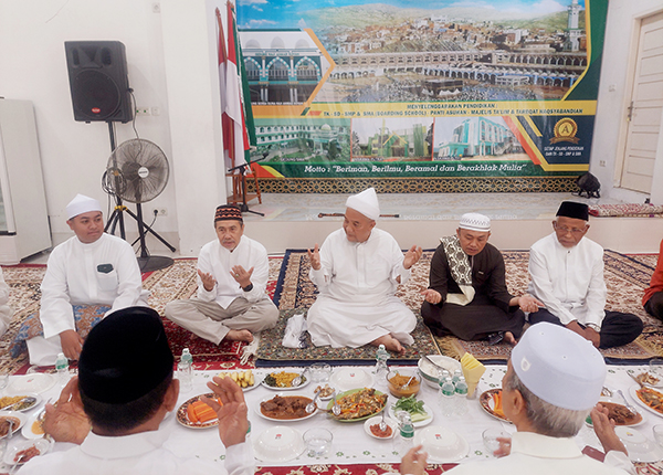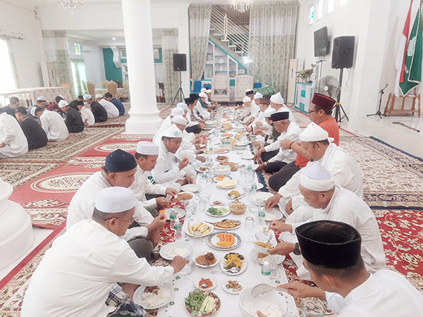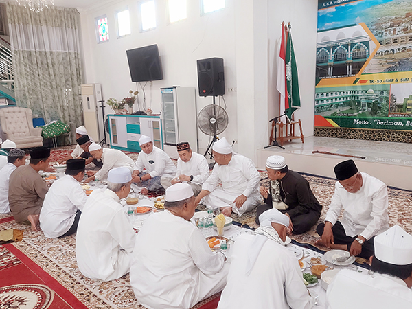 Usai shalat berjamaah, dilanjutkan dengan makan siang bersama di Gedung Haji Ahmad Royan. Ini makan siang informal. Sebab sudah menjadi tradisi sejak Pondok Pesantren berdiri.