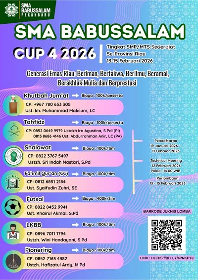 SMA Babussalam Pekanbaru kembali menggelar kompetisi prestisius SMASBA Cup 4 tahun 2026. Ini akan menjadi panggung gemilang bagi talenta muda siswa siswi SMP dan MTs se-Provinsi Riau.